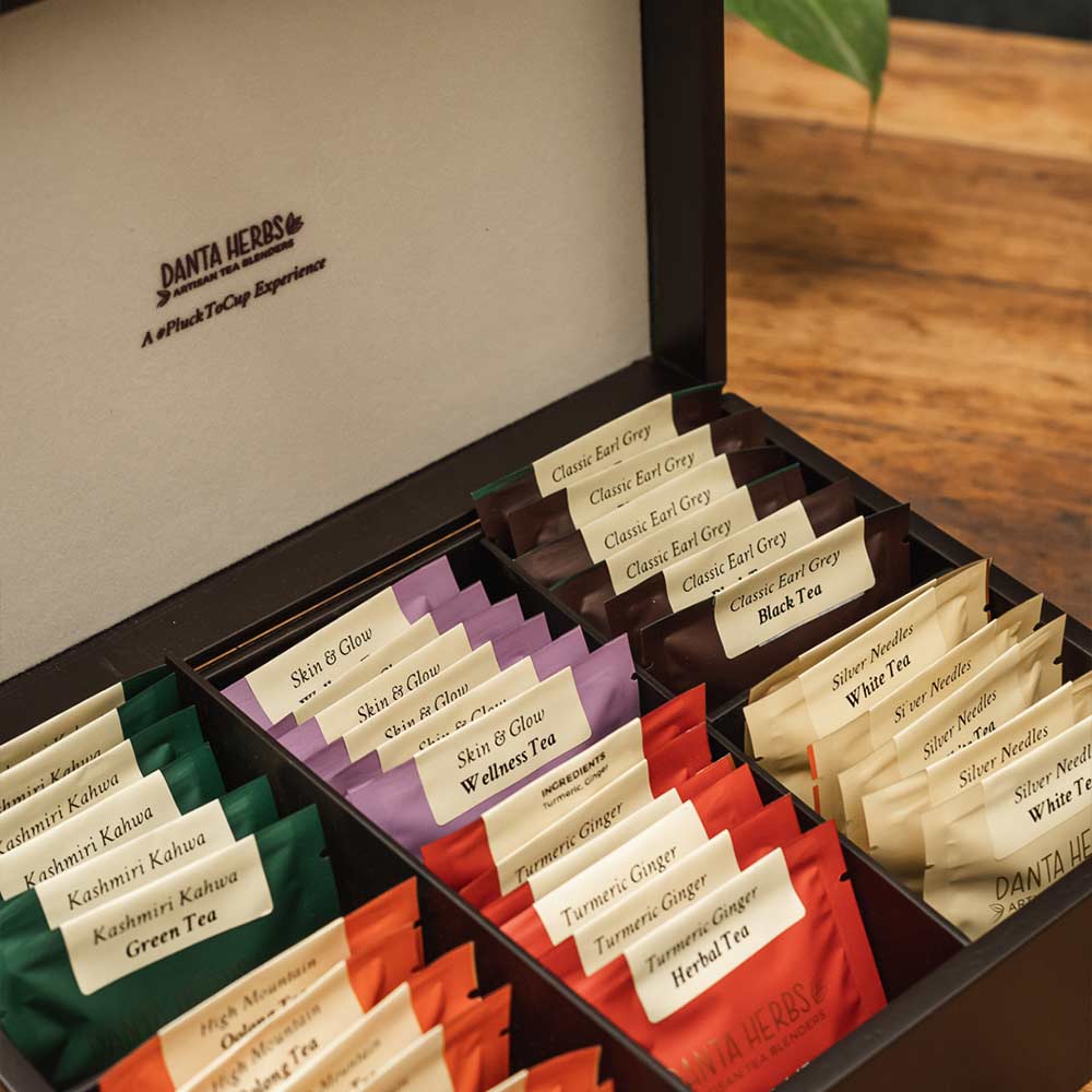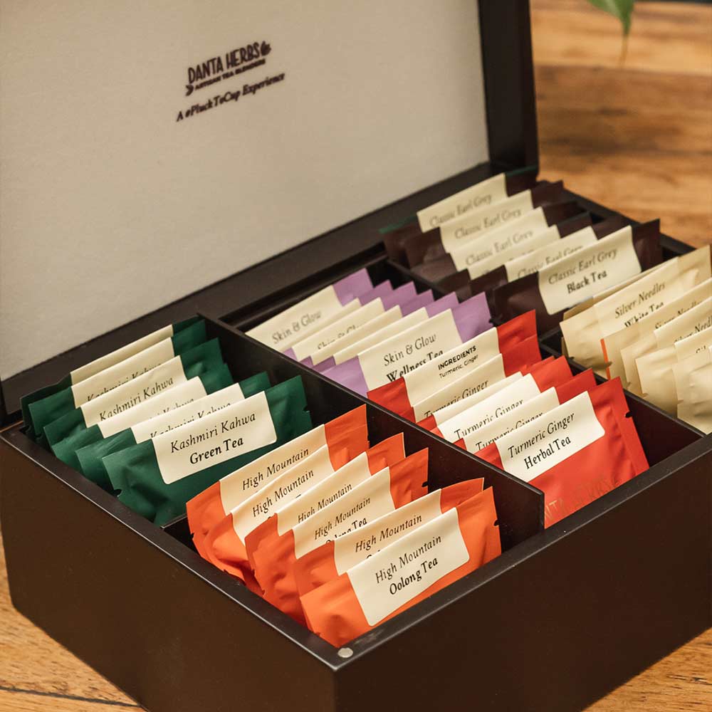 This luxurious tea chest with six types of pyramid shaped tea bags packed mindfully in biodegradable material makes for a beautiful gift also packed.