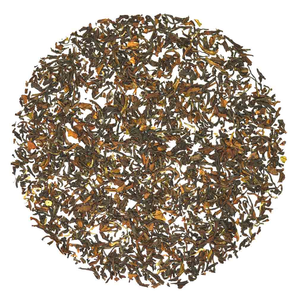 The leaves are evenly graded with a mixed appearance of brown and black leaves and slight presence of silver tips, giving a light flowery aroma with a woody hints