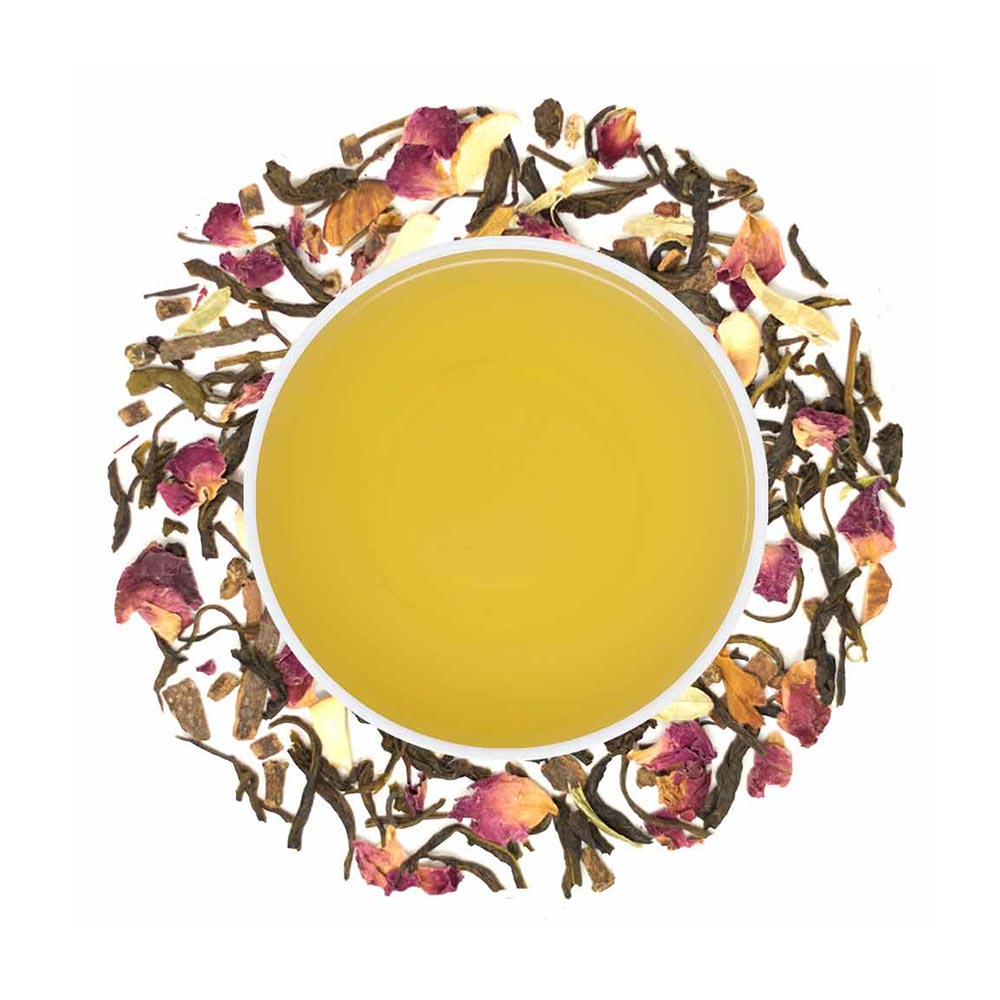 Green Tea, Roasted Almonds, Cinnamon, Cardamom, Clove, Saffron, Rose Petals