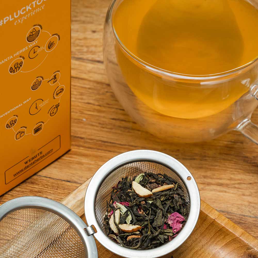 Spoon measured the quantity of tea in the tea maker/pot. Pour boiled water (150 ML) over the tea leaves (2g). Steep for suggested time (3-4 minutes). Strain & sweeten as per choice. Pour it in a cup and enjoy the #PluckToCup experience.
