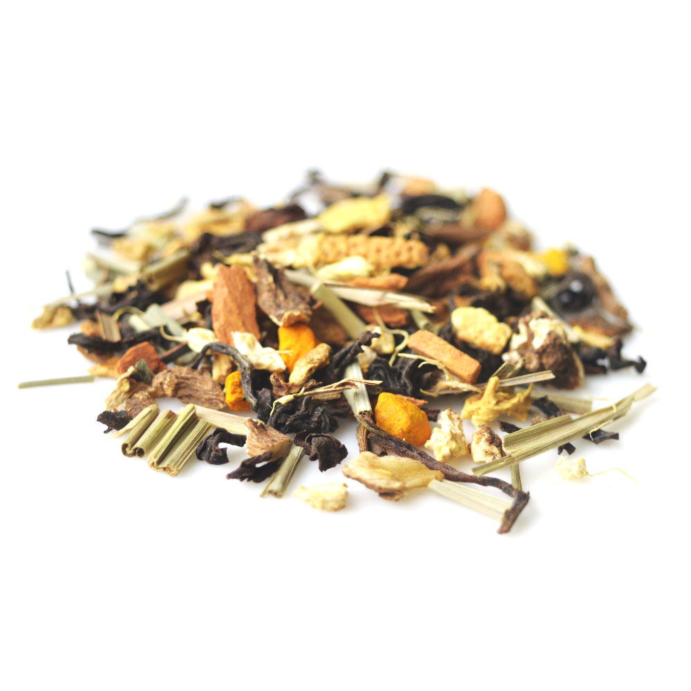 The leaves bear aroma that is herbaceous with a spicy note. The appearance is an eye catching mix of colours from orange peel, turmeric, cinnamon, dandelion and ginger with black tea leaves