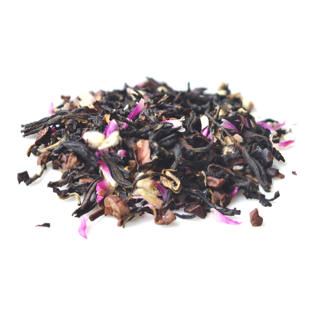 Black Tea, Cocoa beans, Bergamot Oil, Gomphrena Flower