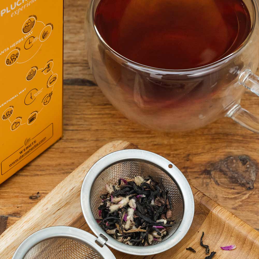 Spoon measured the quantity of tea in the tea maker/pot. Pour boiled water (150 ML) over the tea leaves(2 g). Steep for suggested time (4-5 minutes). Strain & sweeten as per choice. Pour it in a cup and enjoy the #PluckToCup experience.
