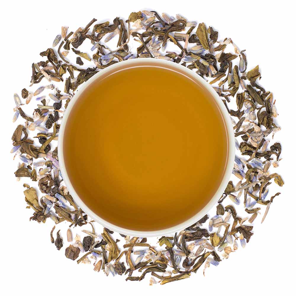 Wiry green tea leaves mix around with purplish blue lavender buds, the play of light against dark creating vividness and intrigue in look and flavor.