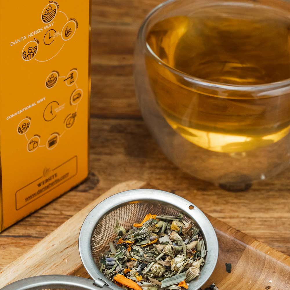 Nettle Leaf, Lemon balm, Chamomile, Vana Tulsi, Lemongrass, Lavender, Rosemary, Marigold